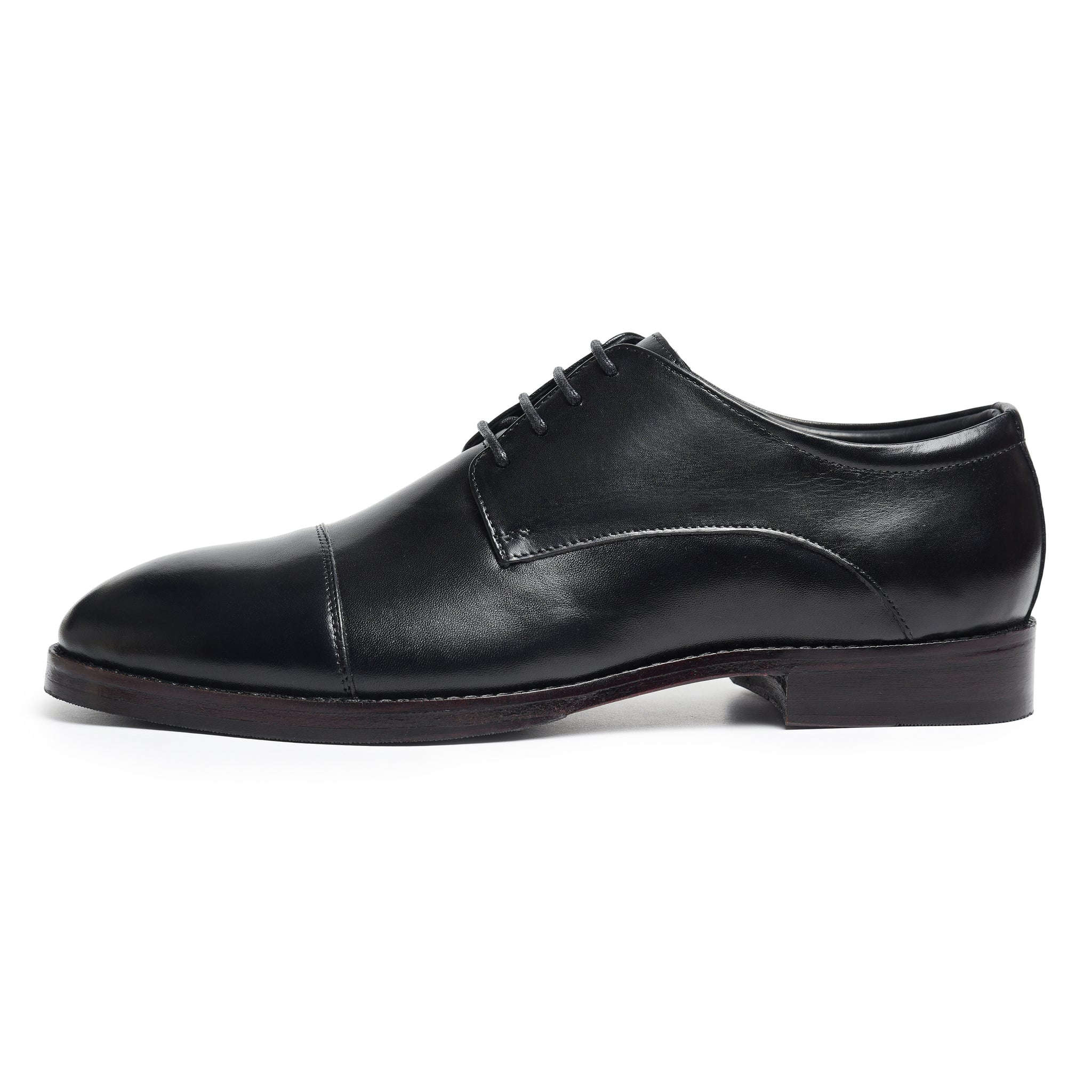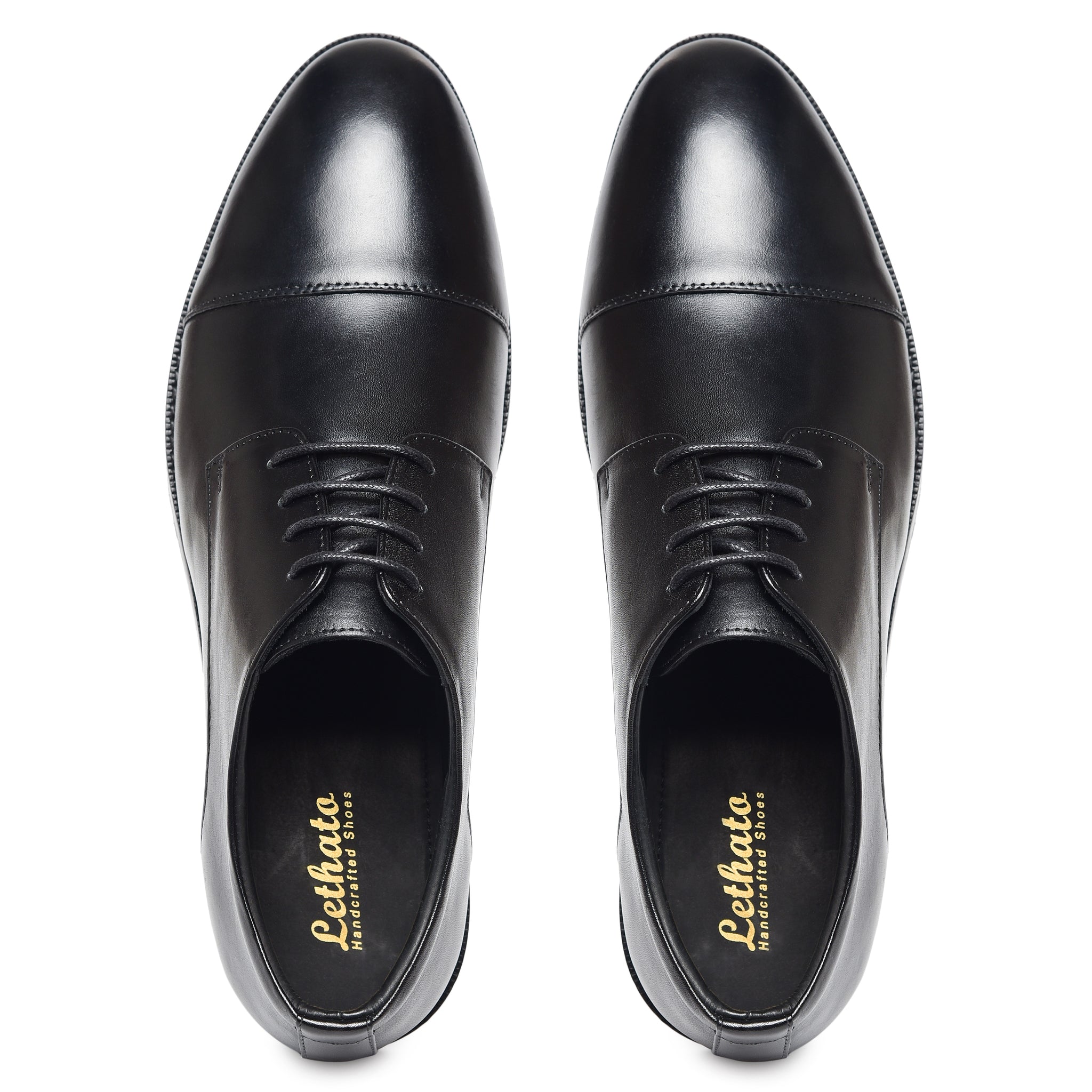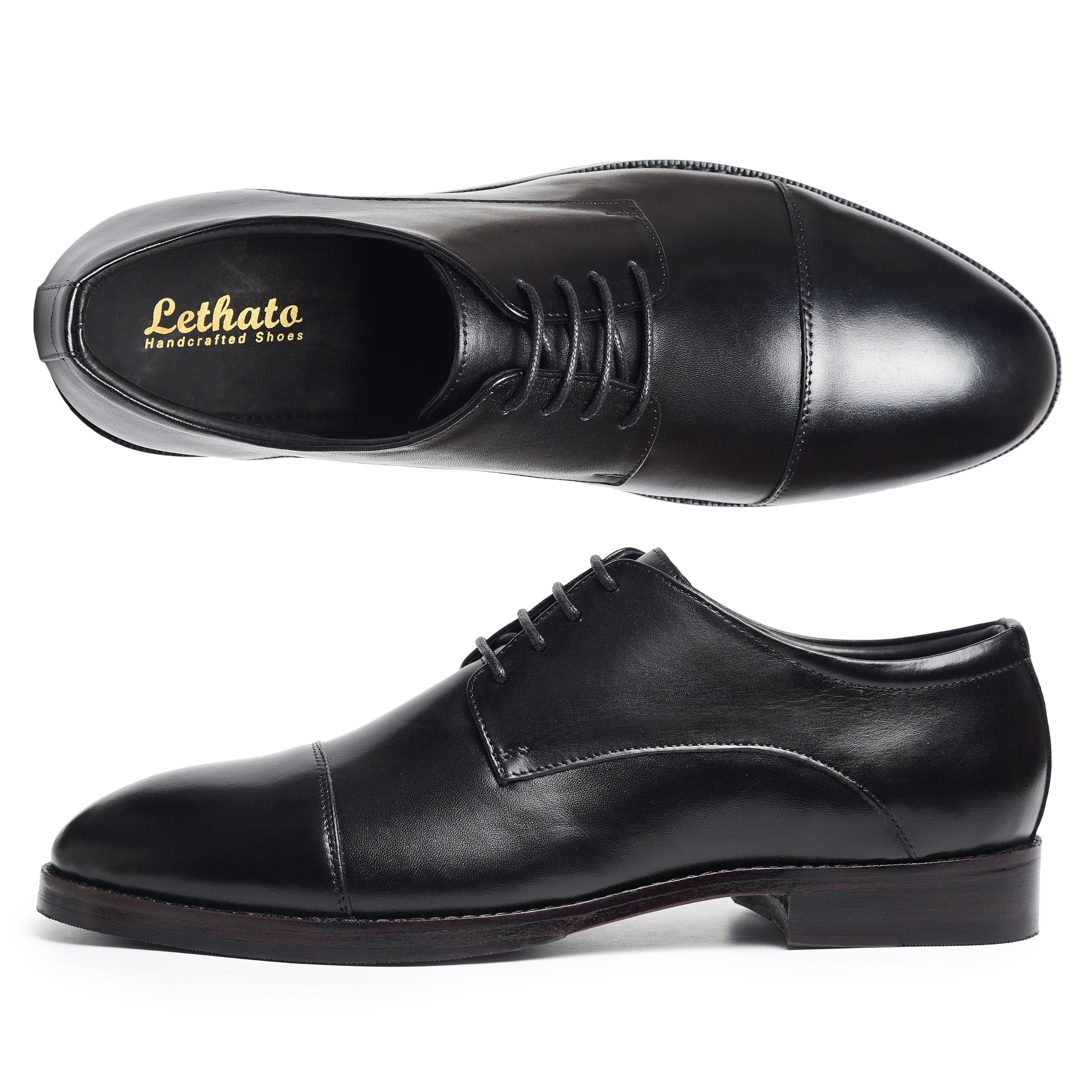 Meet the Lethato Black Derby: where tradition takes a bold step forward. Crafted from supple calf leather, its clean silhouette is defined by a refined open lacing system. The subtle cap toe, adorned with discreet tonal perforations, hints at a story of modern craftsmanship. Built on a sleek, comfort-focused last with a polished leather sole, this is the foundational shoe. Timeless, versatile, and engineered for the discerning stride. Your uniform for every ambition.