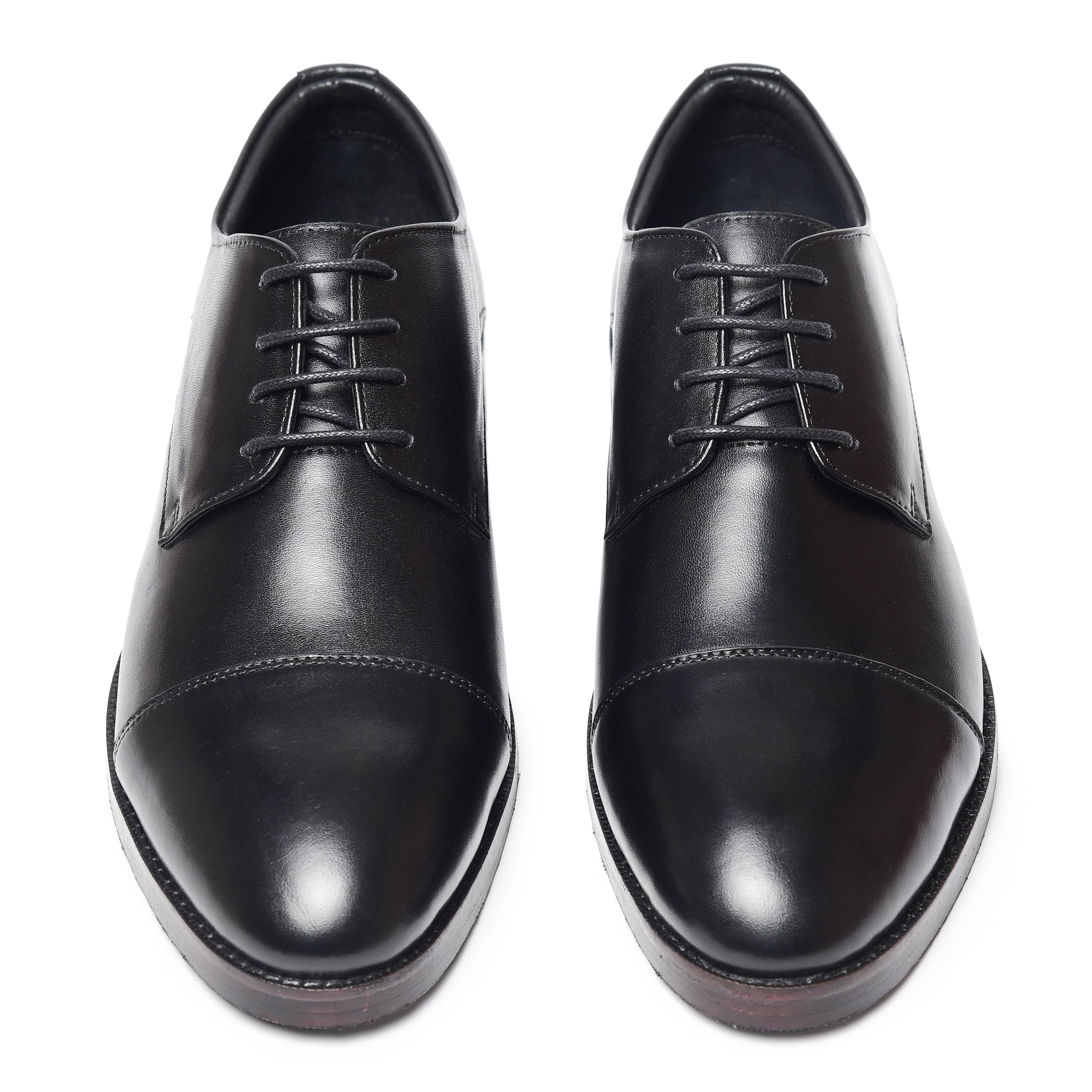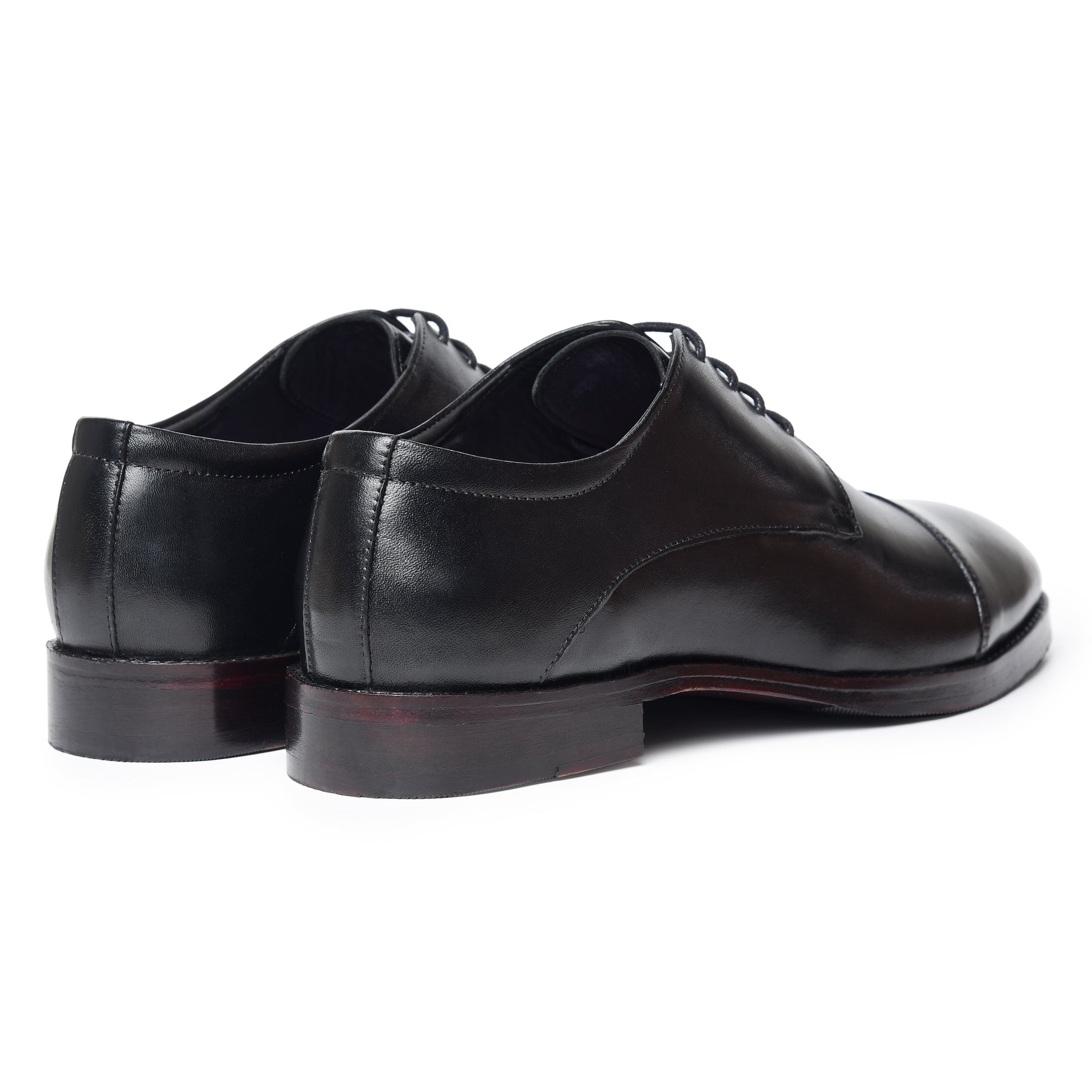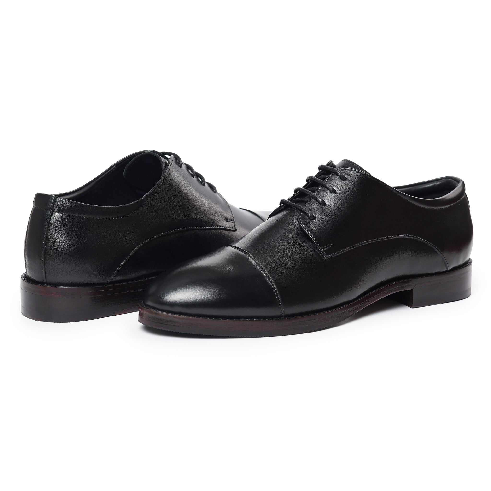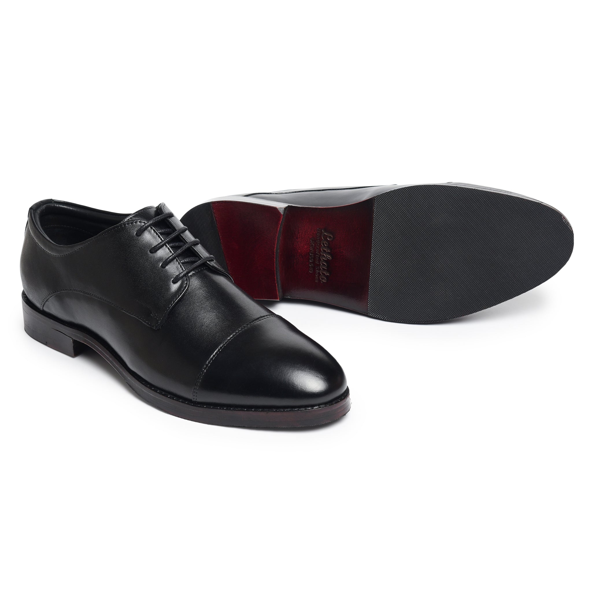 Meet the Lethato Black Derby: where tradition takes a bold step forward. Crafted from supple calf leather, its clean silhouette is defined by a refined open lacing system. The subtle cap toe, adorned with discreet tonal perforations, hints at a story of modern craftsmanship. Built on a sleek, comfort-focused last with a polished leather sole, this is the foundational shoe. Timeless, versatile, and engineered for the discerning stride. Your uniform for every ambition.